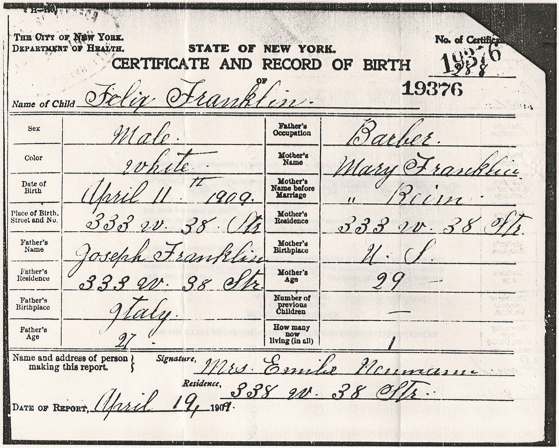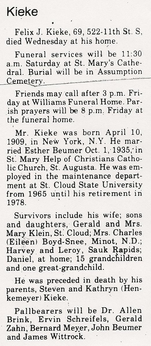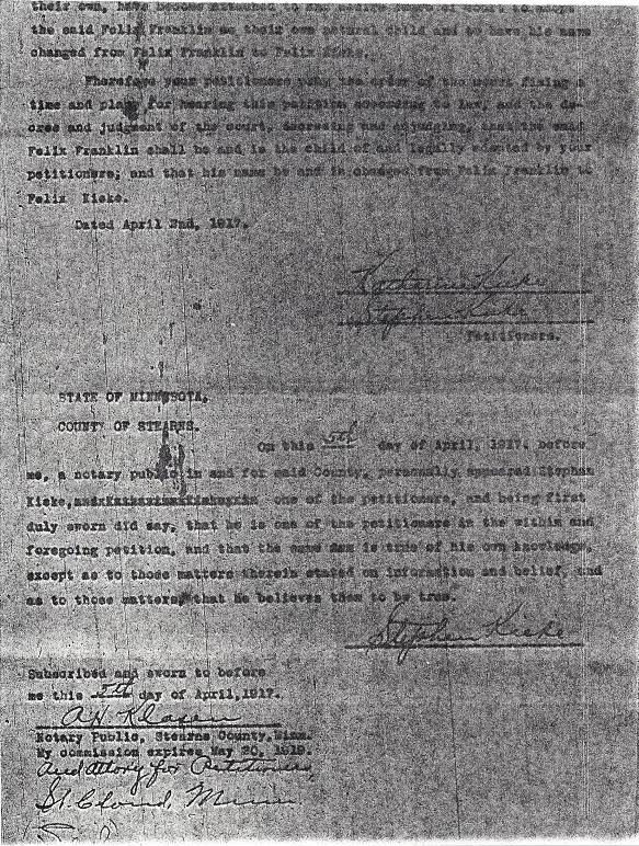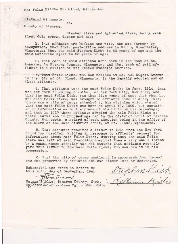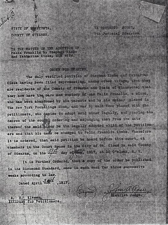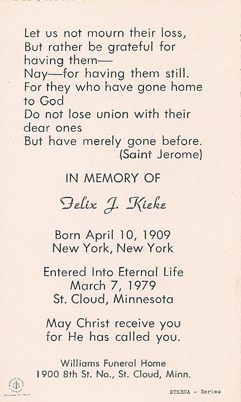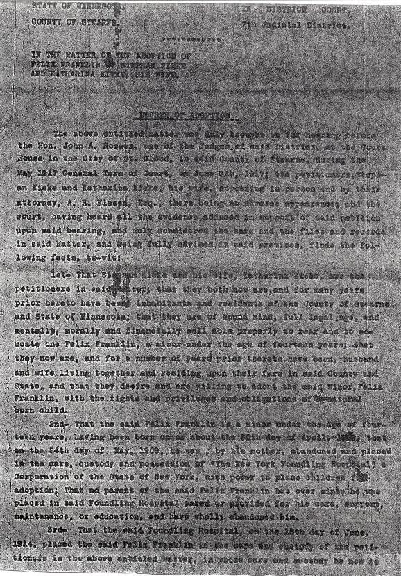 Felix was born in the Manhattan borough of New York City to the Italian immigrants, Joseph and Mary (Reim) Franklin. He was left at the New York Foundling Hospital in New York City, when he was 45 days old by his mother who was unable to care for him. In June of 1914 Felix came to Minnesota aboard an orphan train where he was taken in by Steven and Katherine Kieke of St. Augusta. He was legally adopted through the county of Stearns on March 8th, 1917.