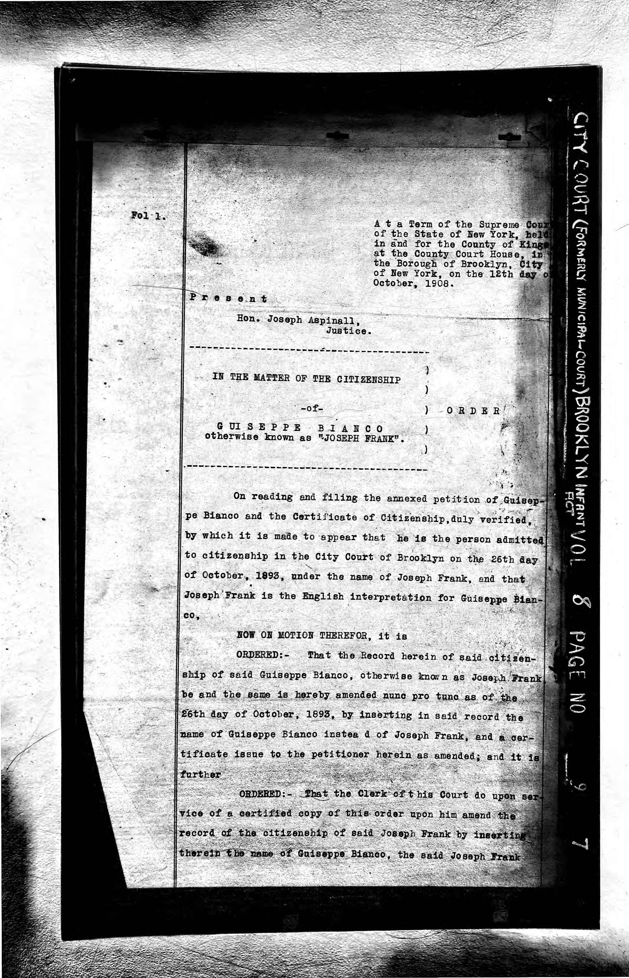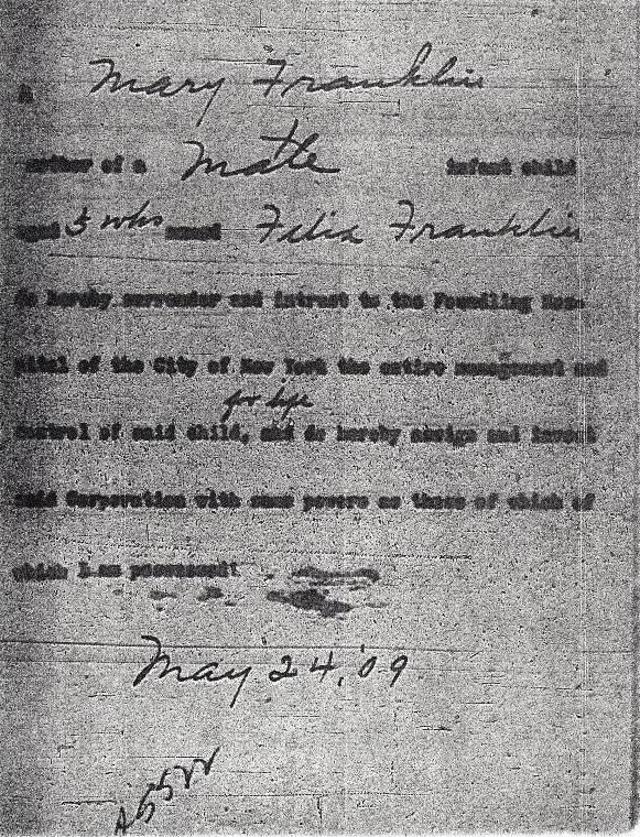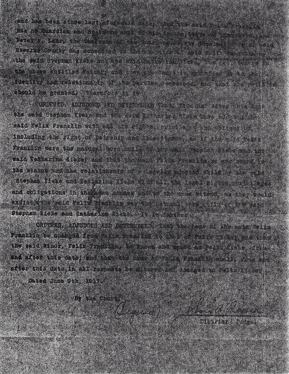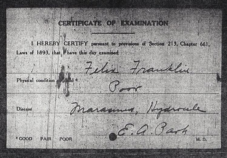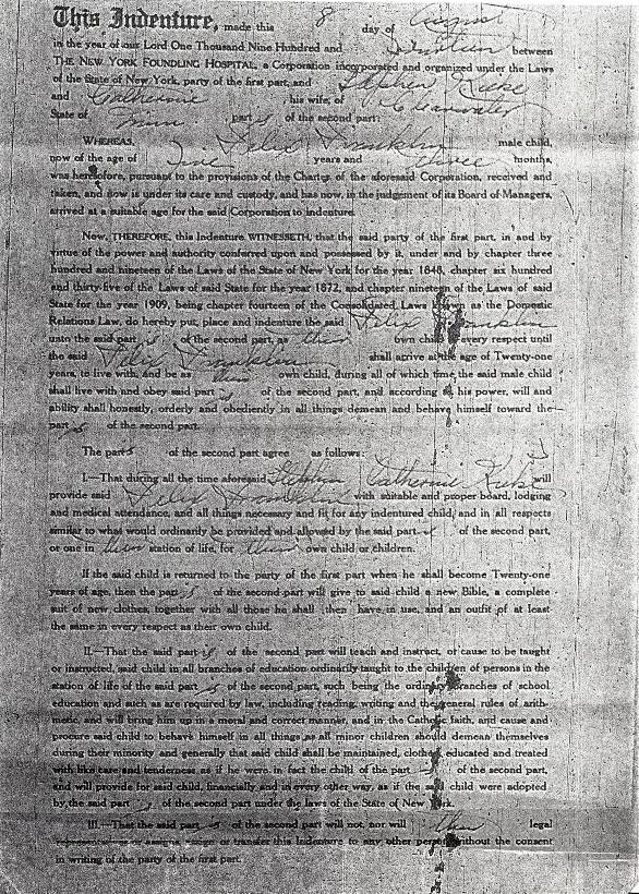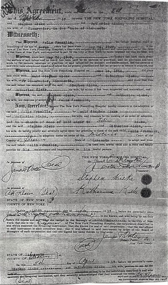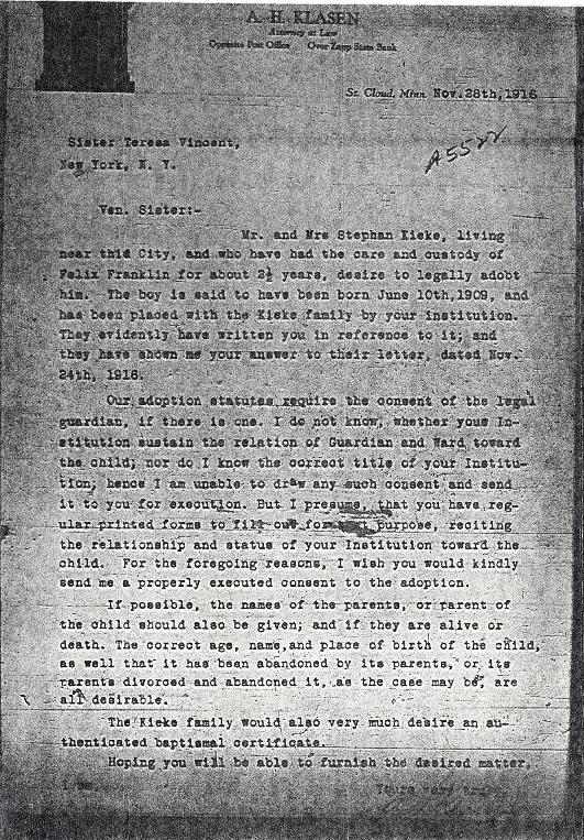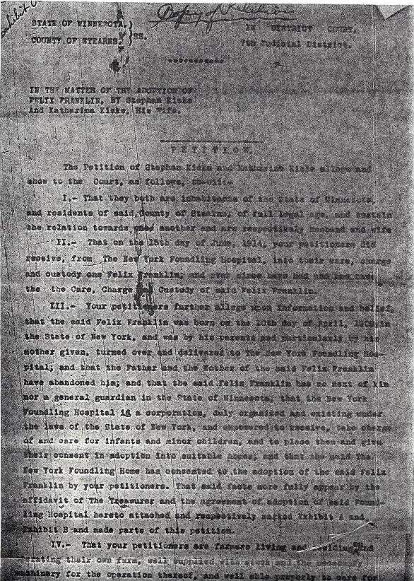 Felix was born in the Manhattan borough of New York City to the Italian immigrants, Joseph and Mary (Reim) Franklin. He was left at the New York Foundling Hospital in New York City, when he was 45 days old by his mother who was unable to care for him. In June of 1914 Felix came to Minnesota aboard an orphan train where he was taken in by Steven and Katherine Kieke of St. Augusta. He was legally adopted through the county of Stearns on March 8th, 1917.